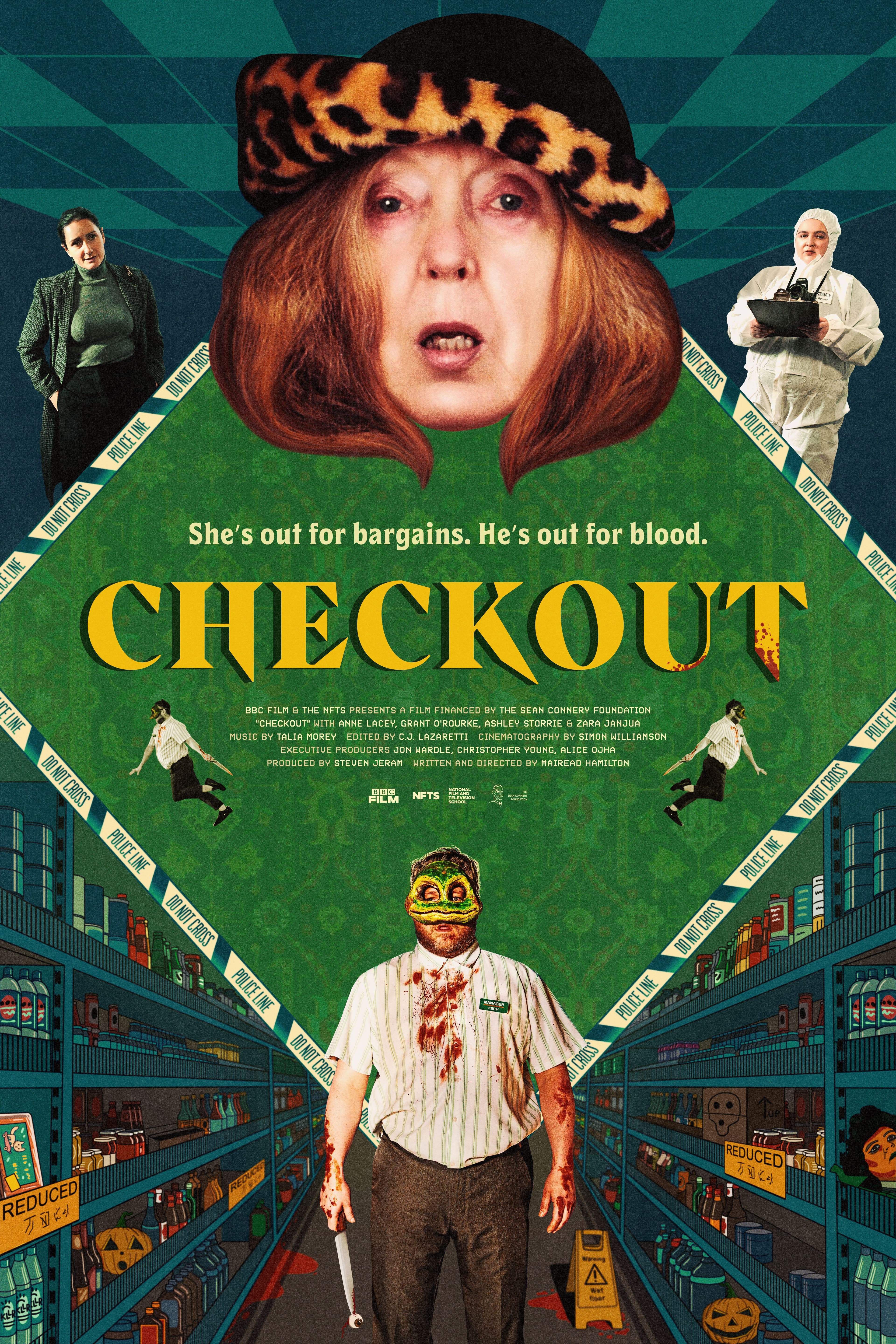 BBC FILM & THE NFTS presents a film financed by THE SEAN CONNERY FOUNDATION - "CHECKOUT" with ANNE LACEY, GRANT O'ROURKE, ASHLEY STORRIE & ZARA JANJUA music by TALIA MOREY edited by C.J. LAZARETTI graphic design by JAHAN BAKSHI cinematography by SIMON WILLIAMSON executive producers JON WARDLE, CHRISTOPHER YOUNG, EVA YATES produced by STEVEN JERAM written & directed by MAIREAD HAMILTON