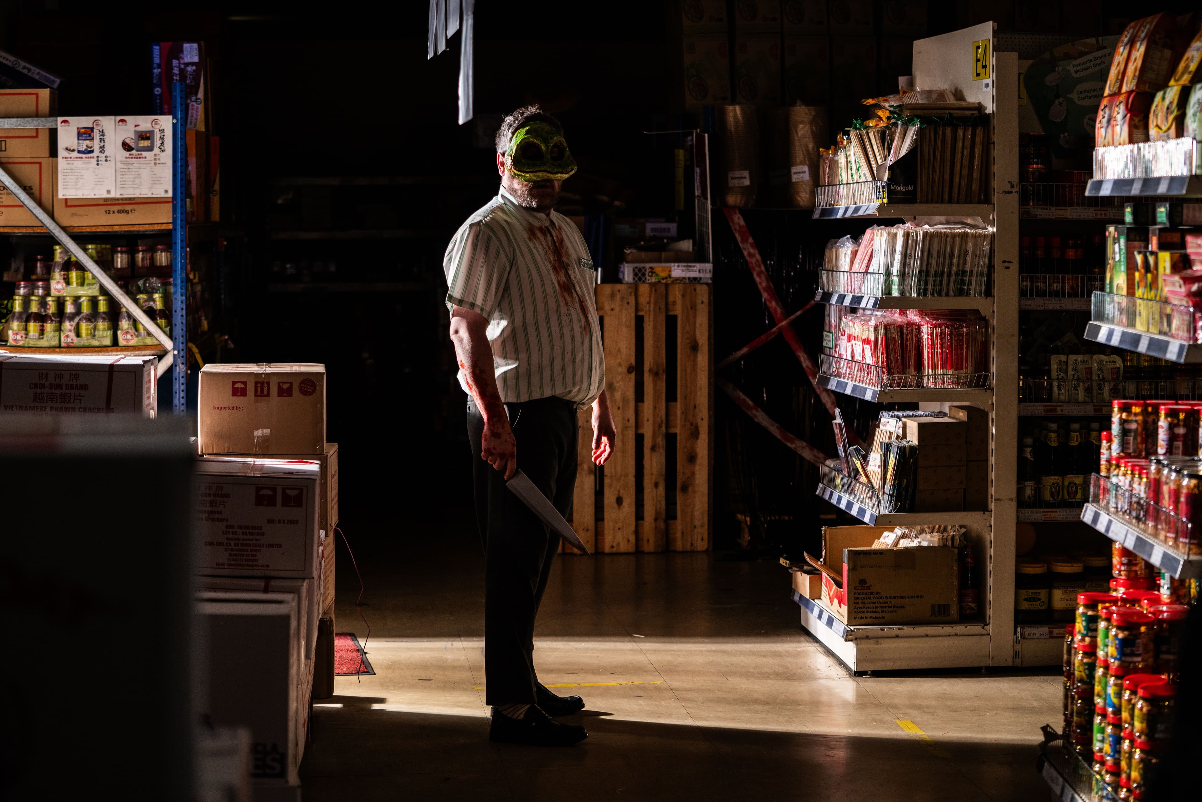 "A cantankerous elderly hermit, on her daily pilgrimage to the supermarket to scour the “reduced-to-clear” section, gets more than she bargained for when she finds herself trapped inside with a masked killer."